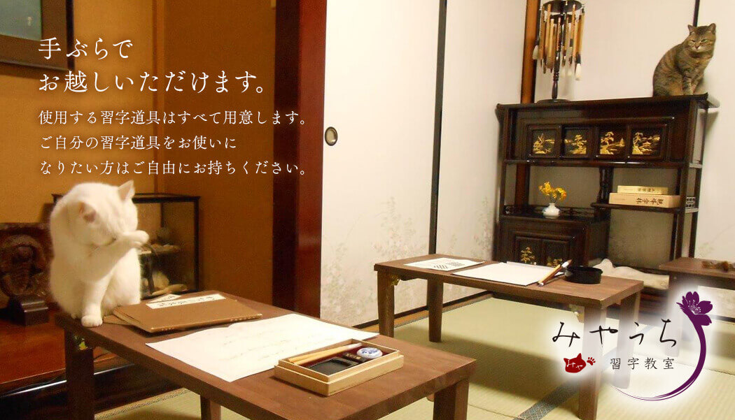 はじめまして、宮内習字教室を主宰しております、宮内志のぶと申します。当教室では、少人数制できめ細やかな指導を行い、個々の能力を最大限引き出します。一人ひとり個別に最適な指導法で、書と向き合い、美しい姿勢と集中力を養うことを目指しております。手書き文字の美しさは一生の財産です。ぜひご一緒にやってみましょう。気まぐれな猫たちとともにお待ちしております。