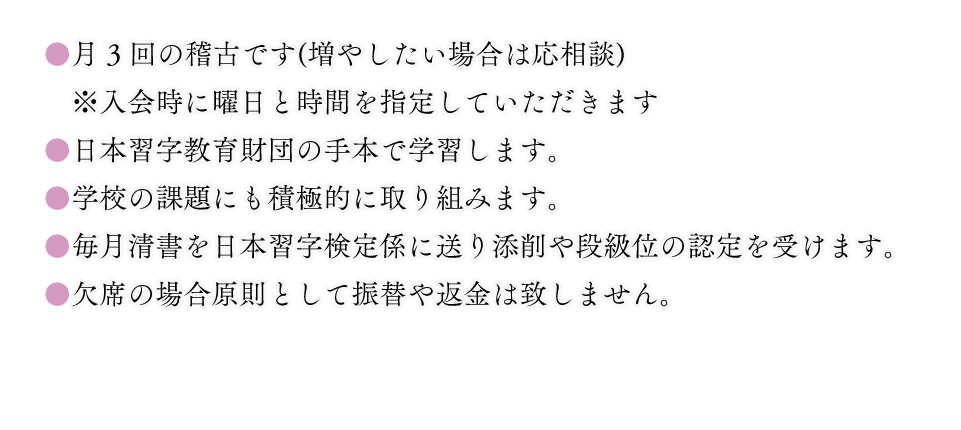 月3回の稽古です(増やしたい場合は応相談) ※入会時に曜日と時間を指定していただきます 日本習字教育財団の手本で学習します。 学校の課題にも積極的に取り組みます。 毎月清書を日本習字検定係に送り添削や段級位の認定を受けます。 欠席の場合原則として振替や返金は致しません。 お子様の入退室をメール・LINE等でお知らせ致します。